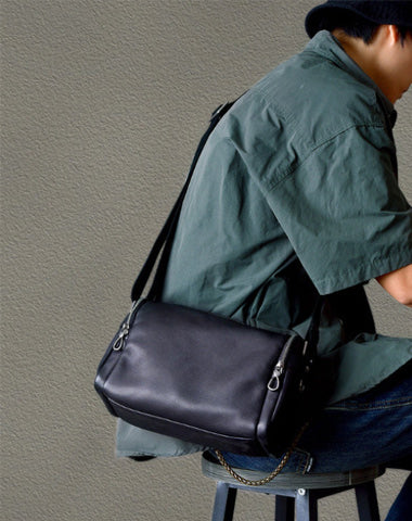Design: Black Leather Men's Small Barrel Side Bag Small Black Messenger Overnight Bag For Men