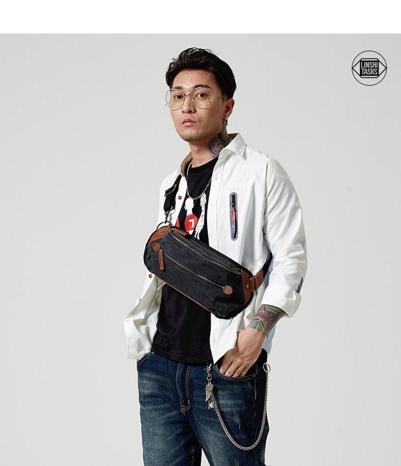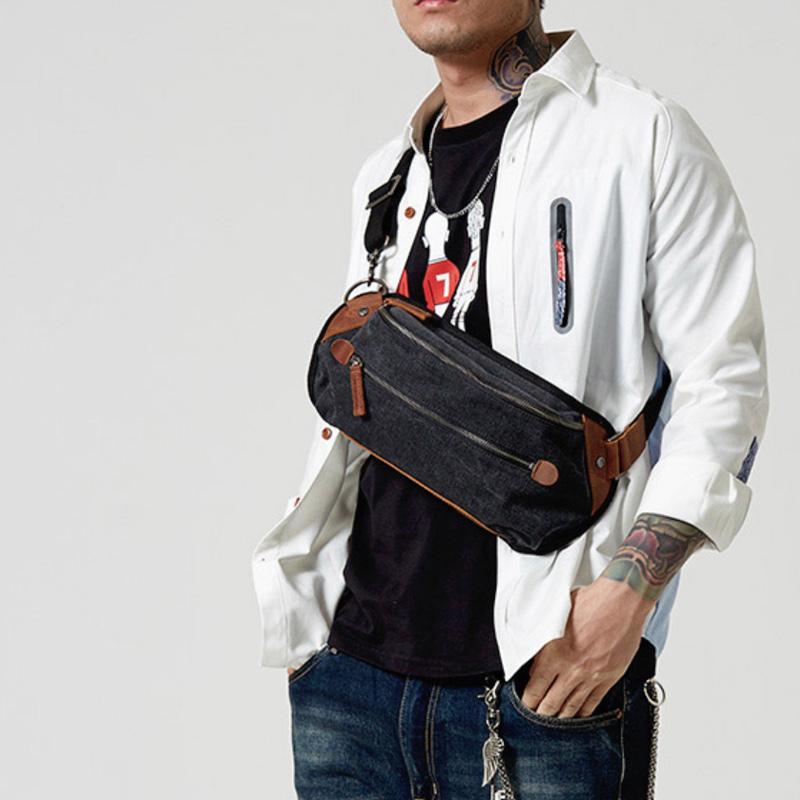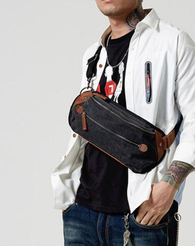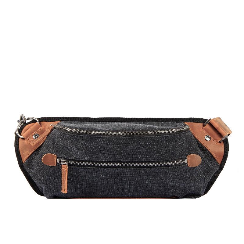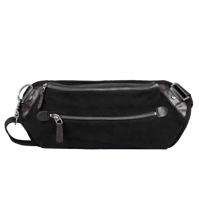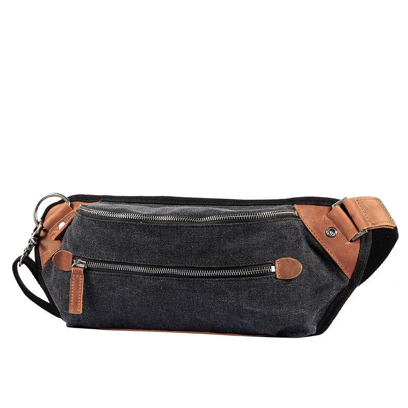 Design: Black Retro Canvas Leather Fanny Pack Men's Chest Bag Sling Hip Bag Waist Bag For Men