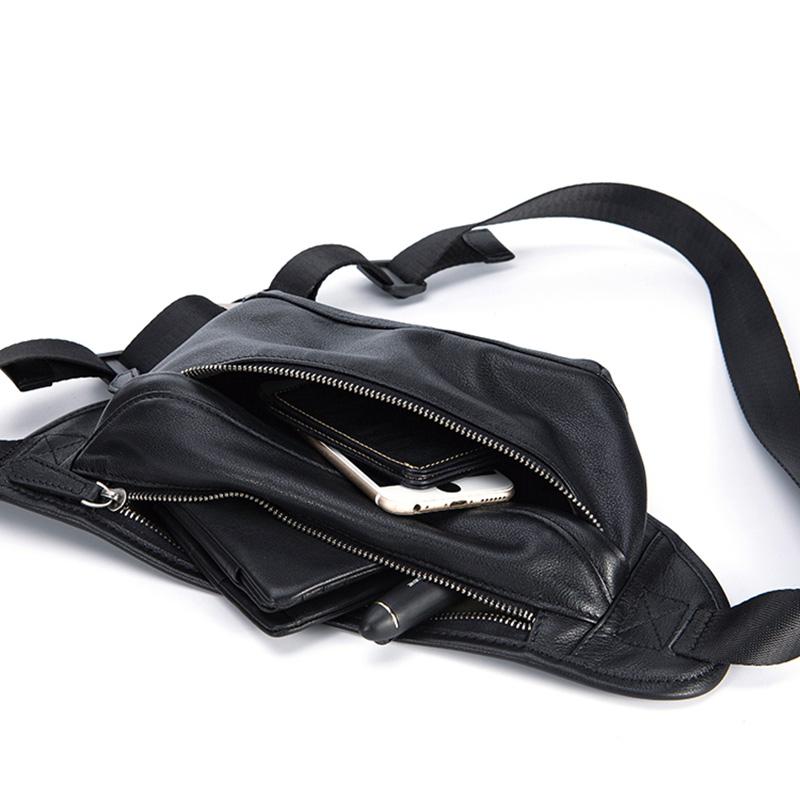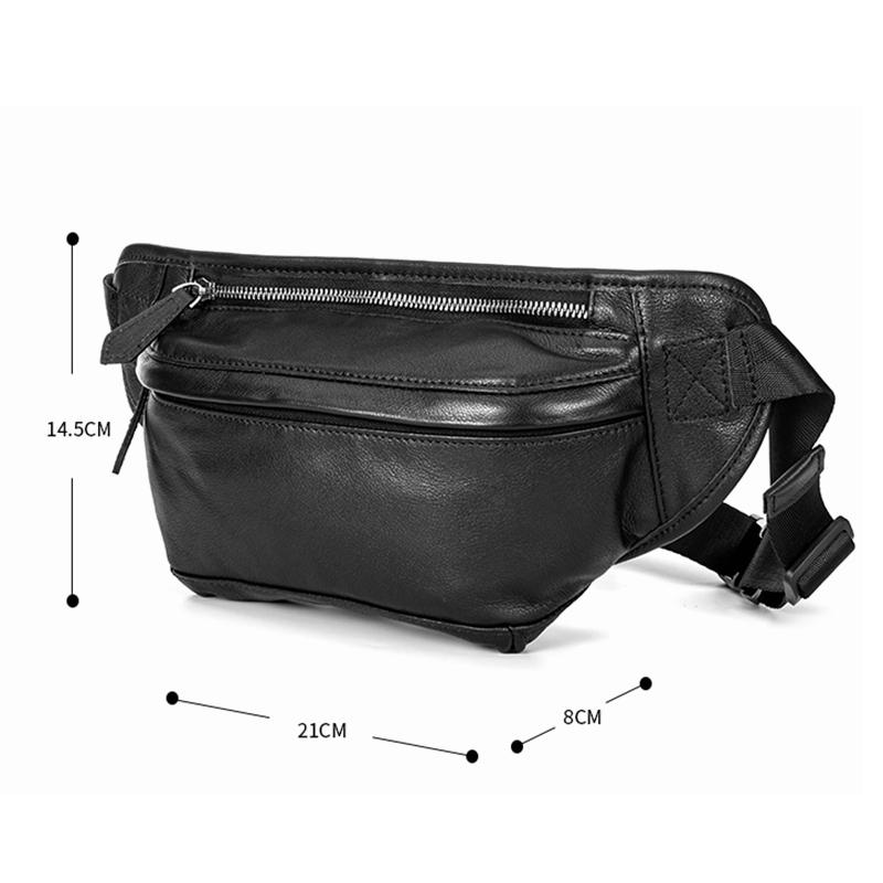 Design: Black Soft Leather Mens 8inches Waist Bag Chest Bag Black One Shoulder Backpack for Men