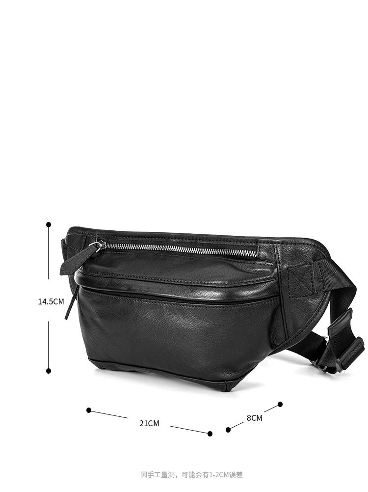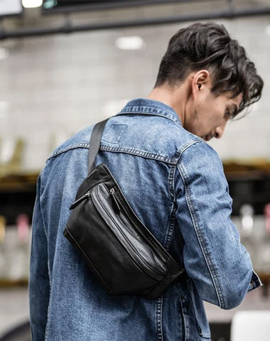 Style: Black Soft Leather Mens 8inches Waist Bag Chest Bag Black One Shoulder Backpack for Men
