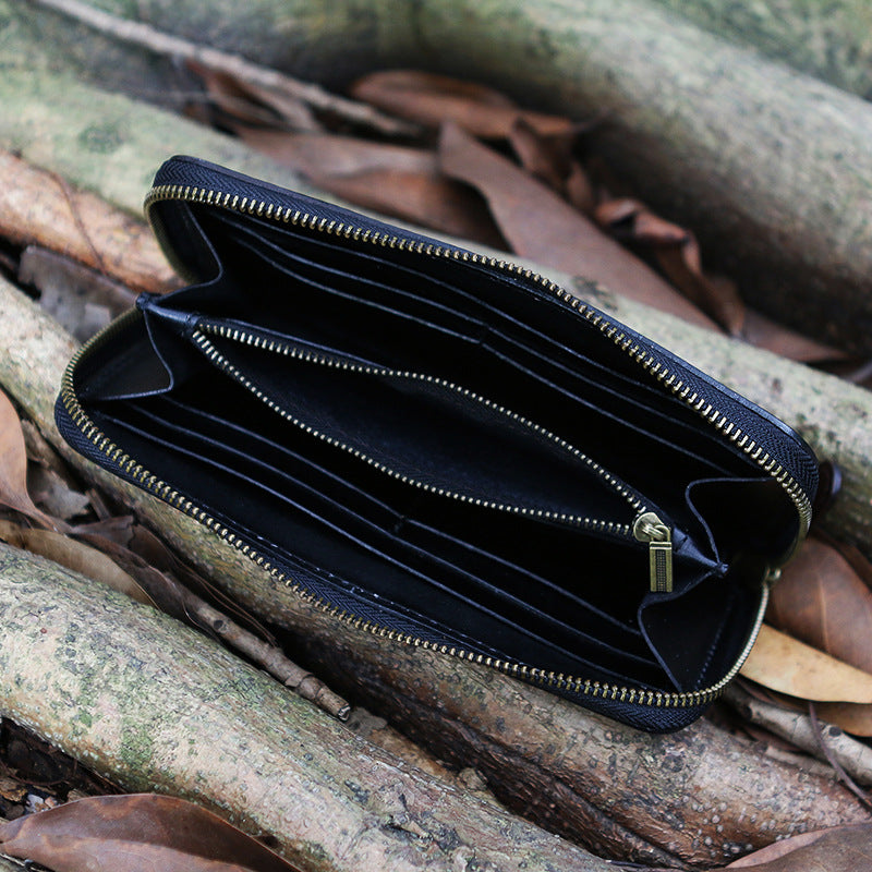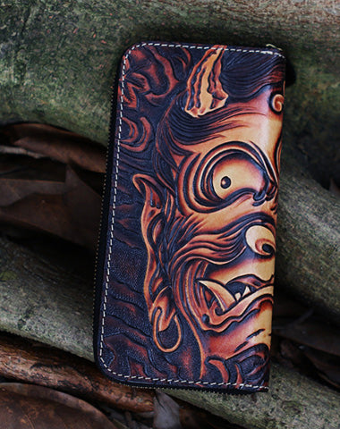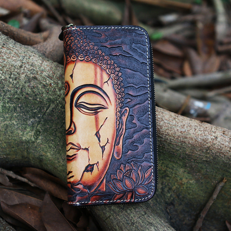Black Tooled Buddha Leather Wallet Handmade Zipper Long Wallets For Men