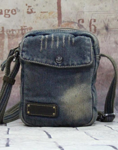 Design: Blue Denim Mens Casual Small Vertical Messenger Bag Jean Chest Bag Shoulder Bag For Men