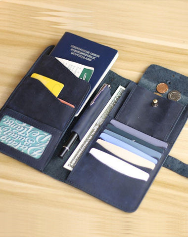 Style: Blue Handmade Leather Mens Passport Holder Muticard Wallet Ticket Holder For Men