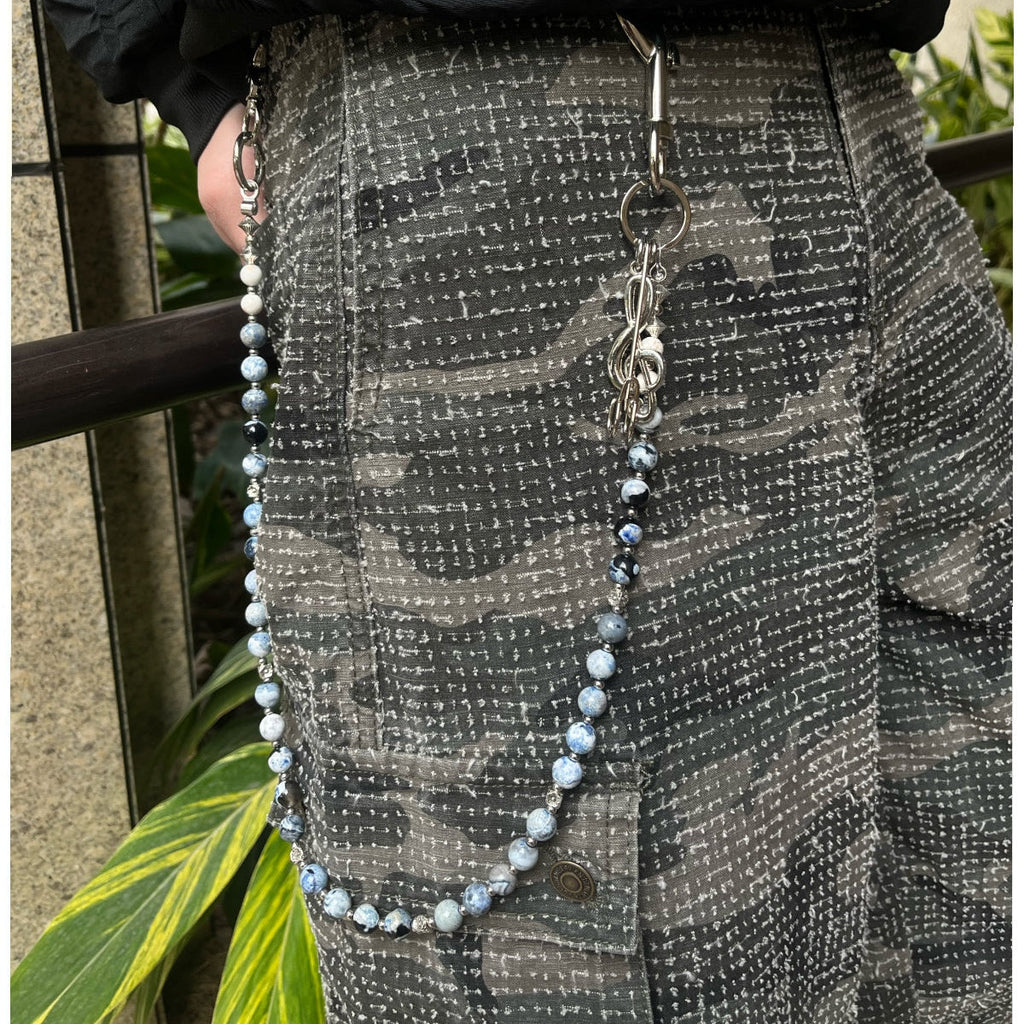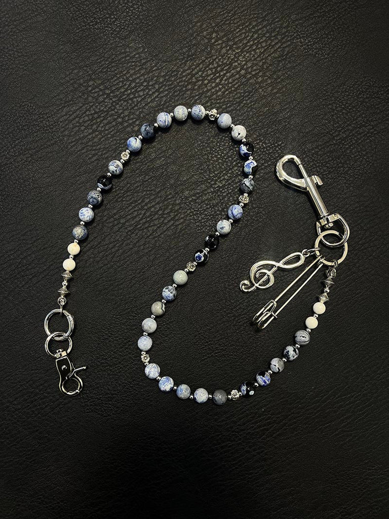 Discover a truly unique accessory with our stunning beaded Wallet Chain, where artistic inspiration meets urban functionality. This 78cm masterpiece features exquisite blue stone beads with natural watercolor-like veining, elegantly paired with delicate plum blossom beads that create a captivating visual rhythm. The chain is finished with a distinctive music note charm and a bold safety pin accessory near the clasp, making this beaded pants chain a perfect blend of artistic expression and alternative edge.