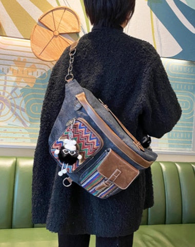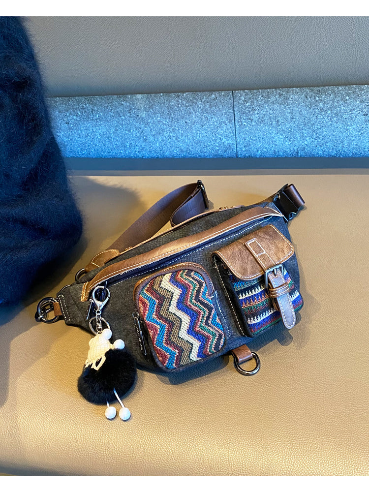 Design: Canvas Boho Embroidery Waist Bag Bohemian Large Canvas Sling Bag Crossbody Bag