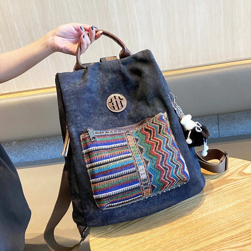 Boho Style Backpack Womens Canvas Backpack Black Gray Embroidery Vintage Boho Backpack
