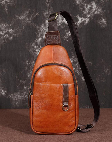 Style: Brown Cool LEATHER MENS 8 inches Sling Bag One Shoulder Backpack Dark Brown Chest Bag For Men