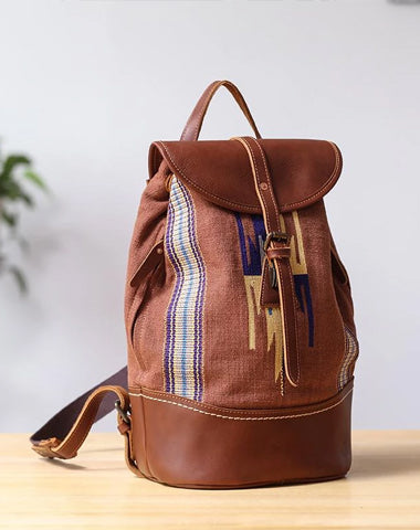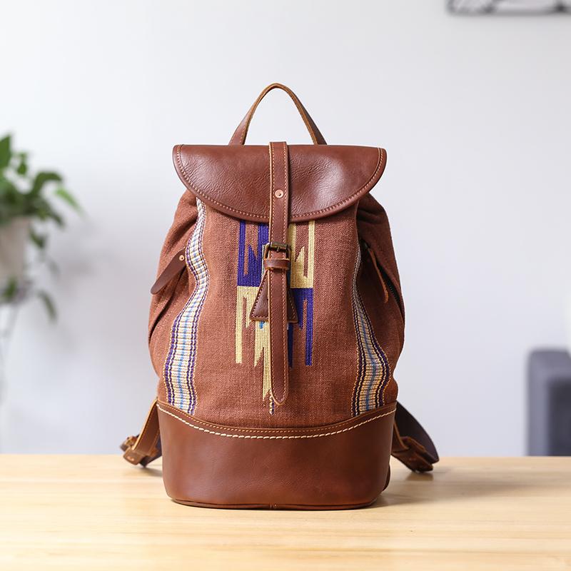 Style: Brown Emroidered Canvas Leather Mens Women Large 15'' College Backpack Travel Backpack for Men
