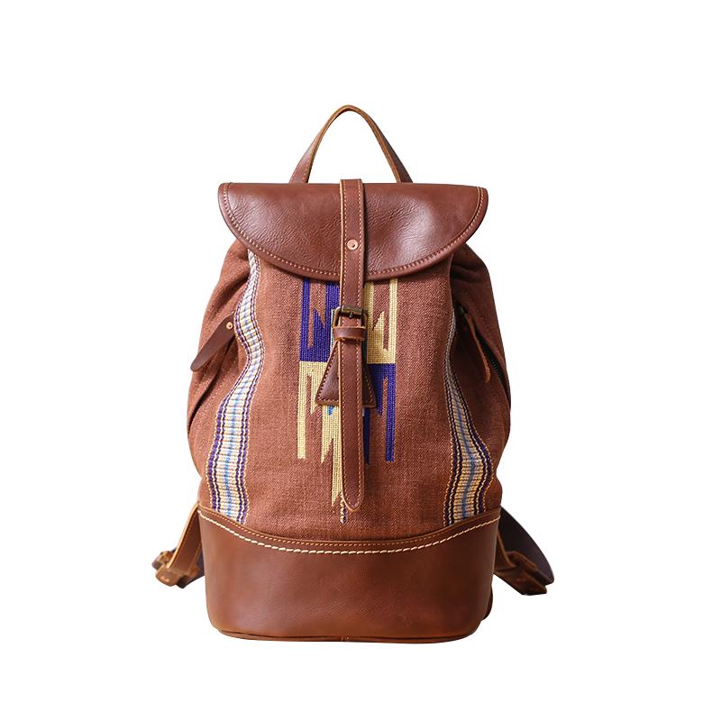 Design: Brown Emroidered Canvas Leather Mens Women Large 15'' College Backpack Travel Backpack for Men