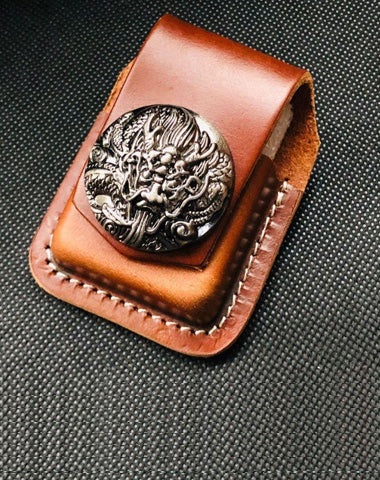 Brown Handmade Leather Mens Chinese Dragon Zippo Lighter Holders Lighter Case For Men
