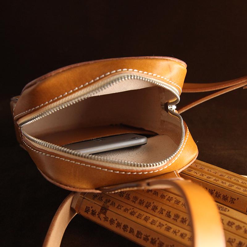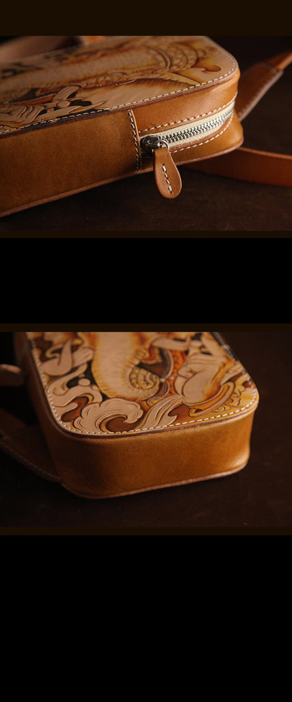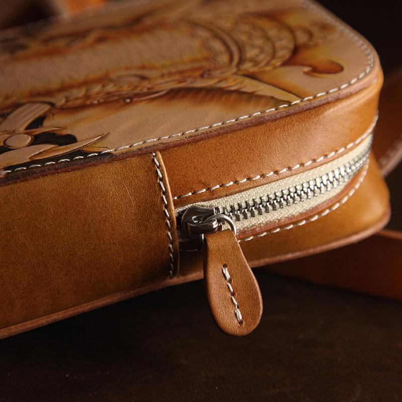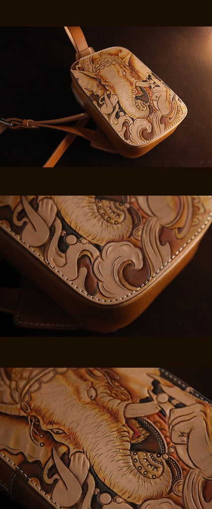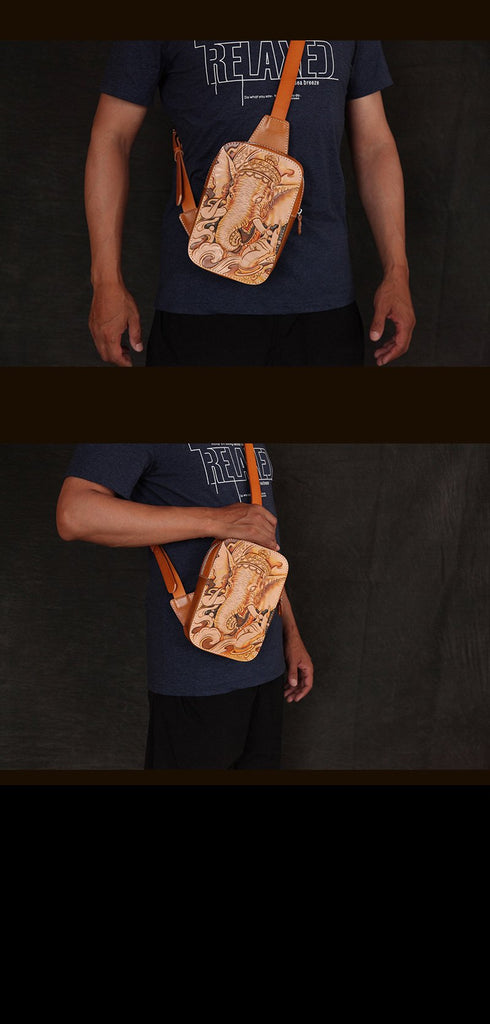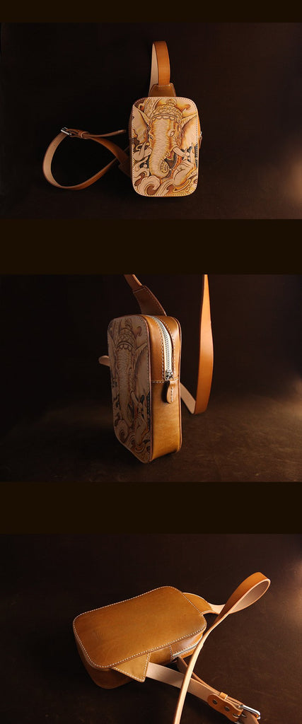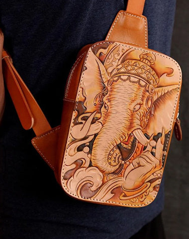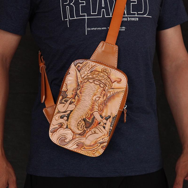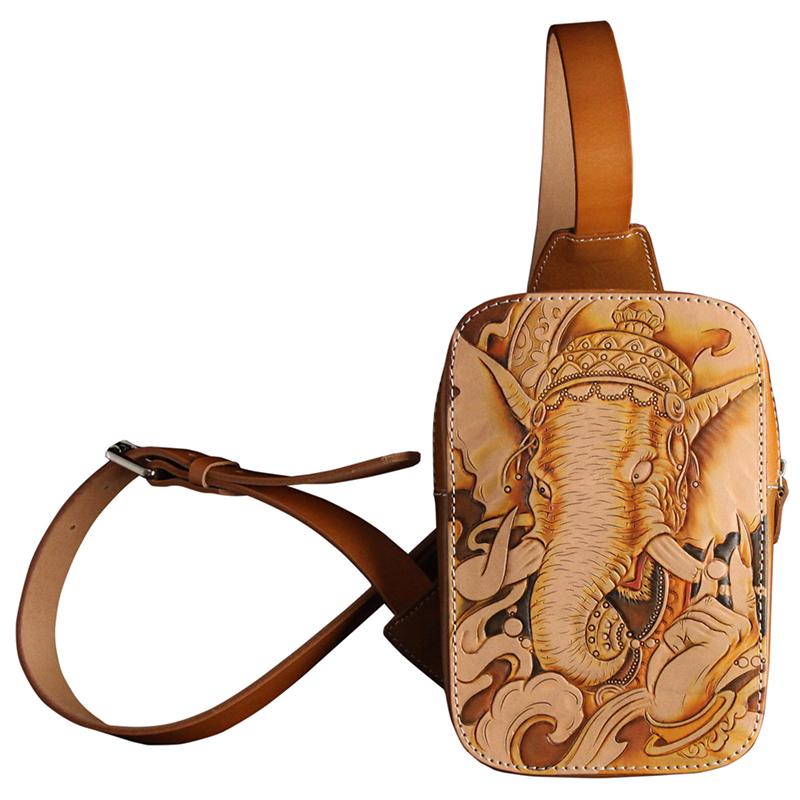 Style: Handmade Beige Ganesha Tooled Leather Sling Bag Chest Bag One Shoulder Backpack For Men