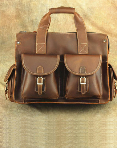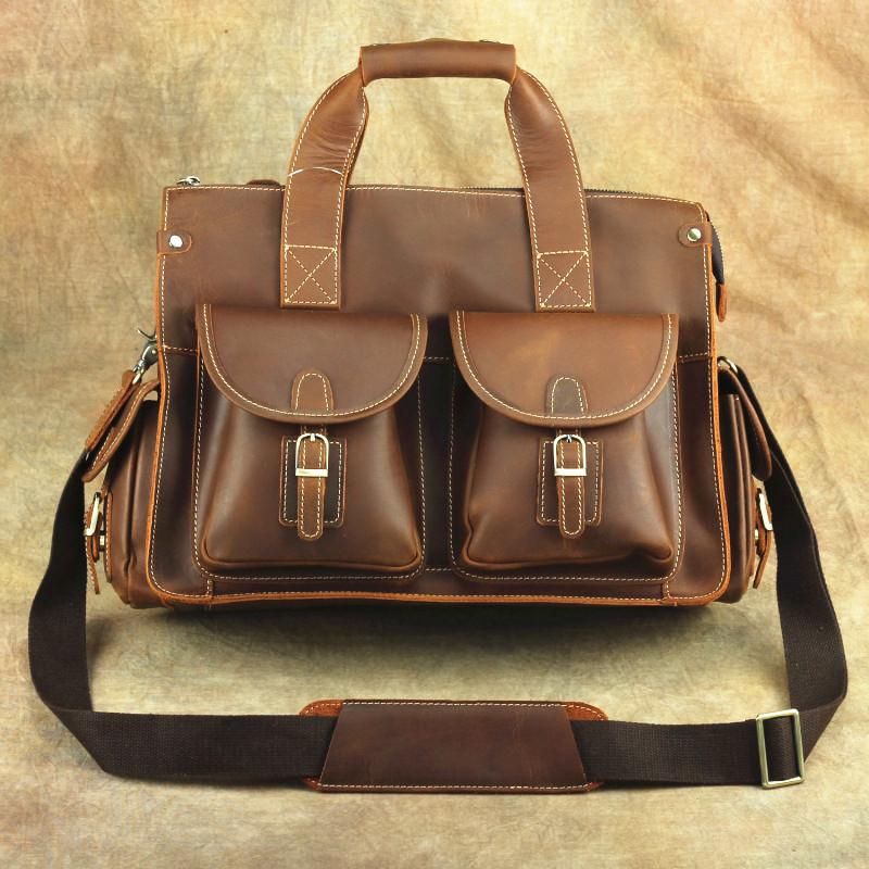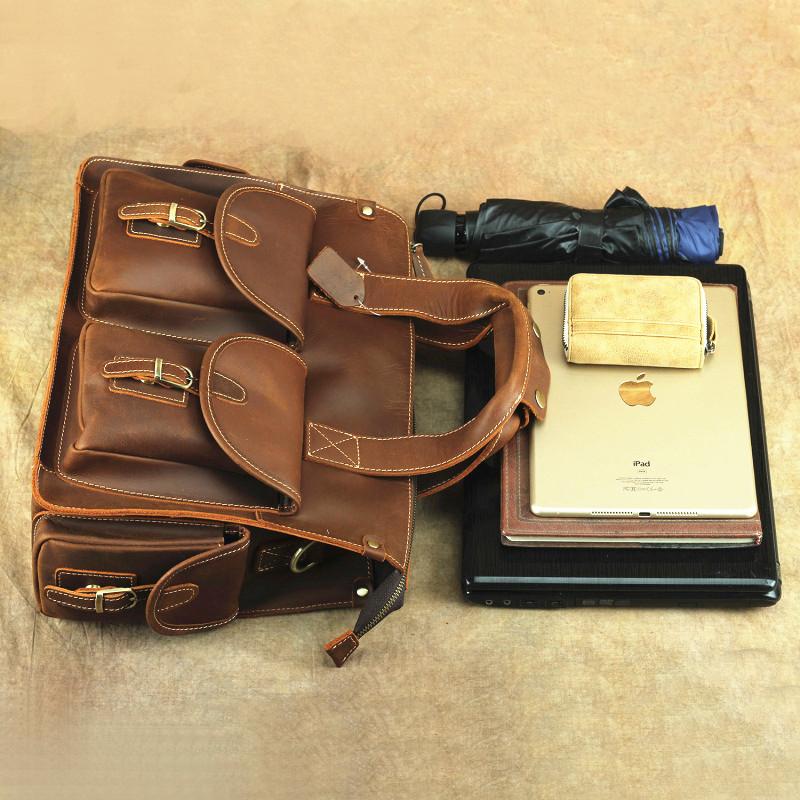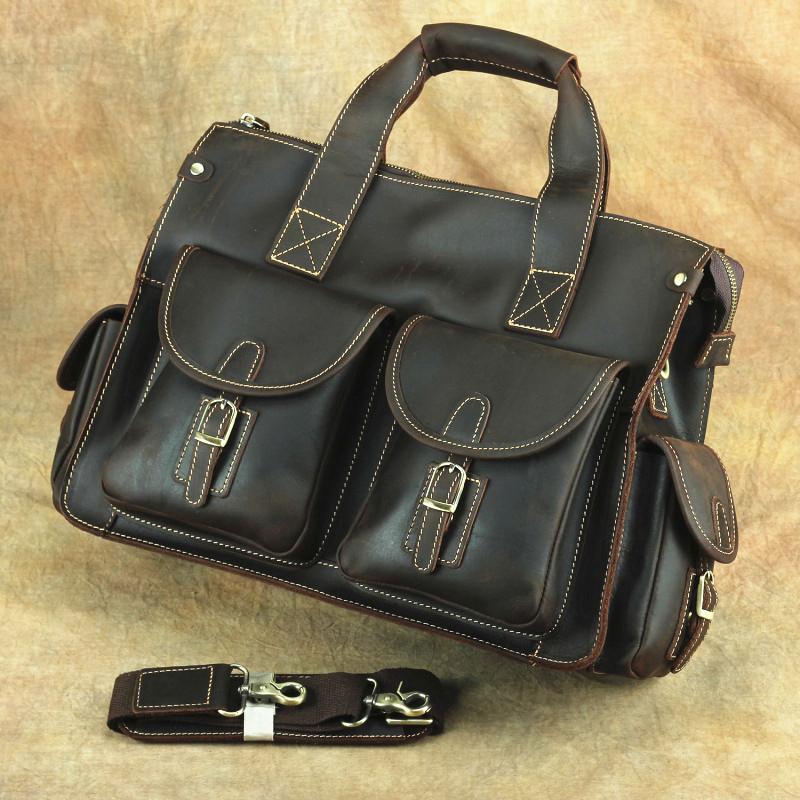Design: Brown Leather Mens 14 inches Business Laptop Work Bag Handbag Briefcase Shoulder Bags Messenger Bags For Men