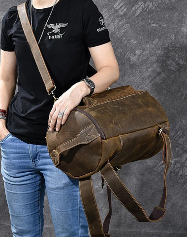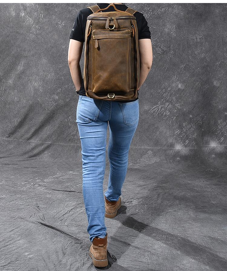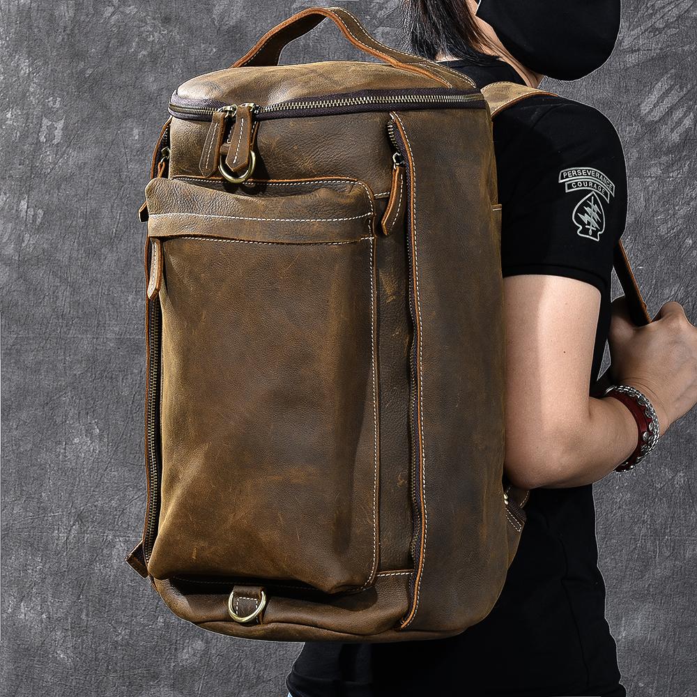 Brown Leather Mens 15" Laptop Bucket Hiking Backpack Travel Backpack Barrel Backpack for Men