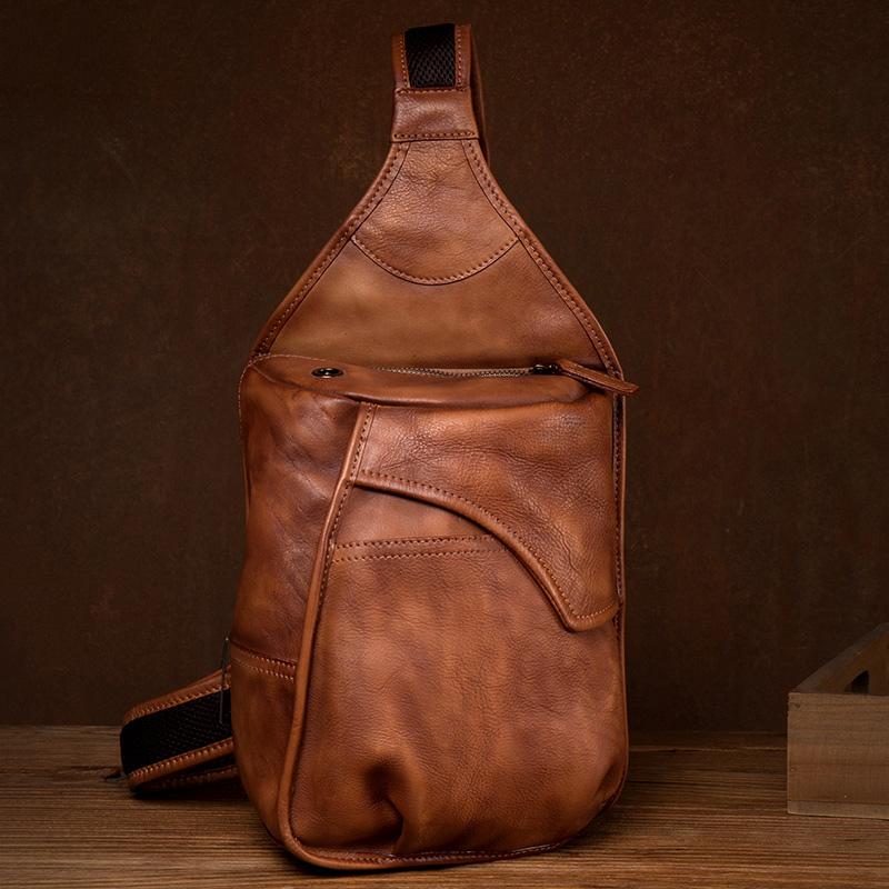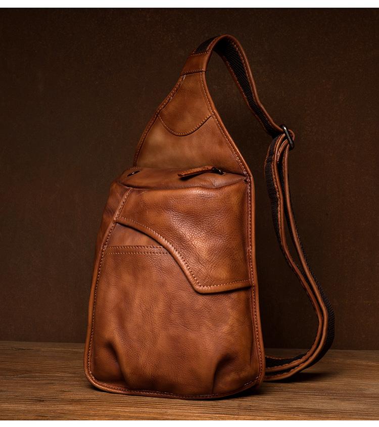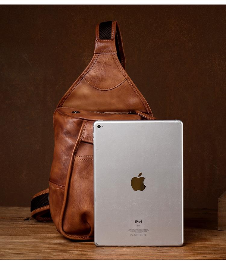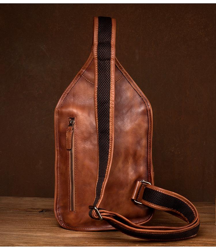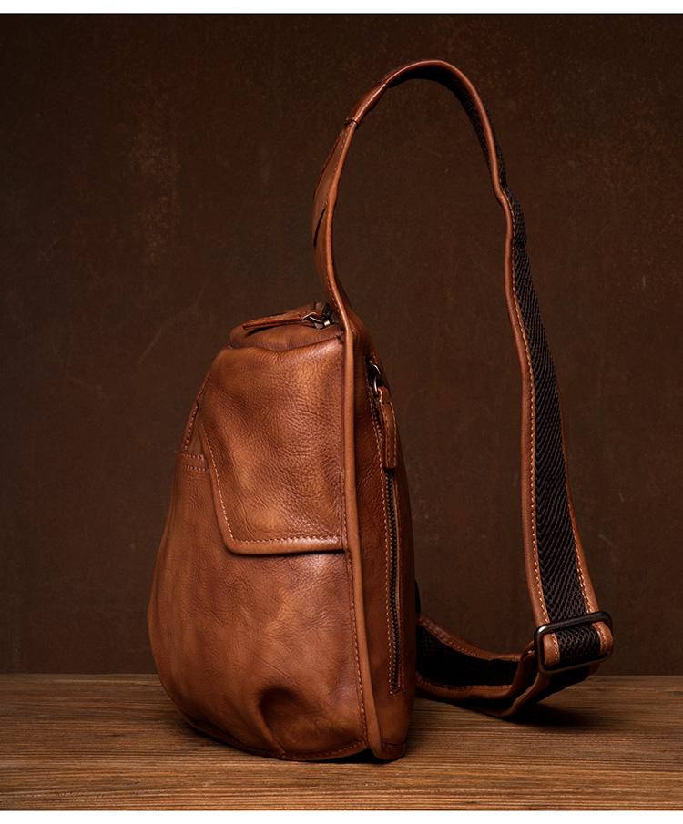 Design: Brown Leather Mens Cool 8 inches Sling Bag Crossbody Bag Chest Bag for men