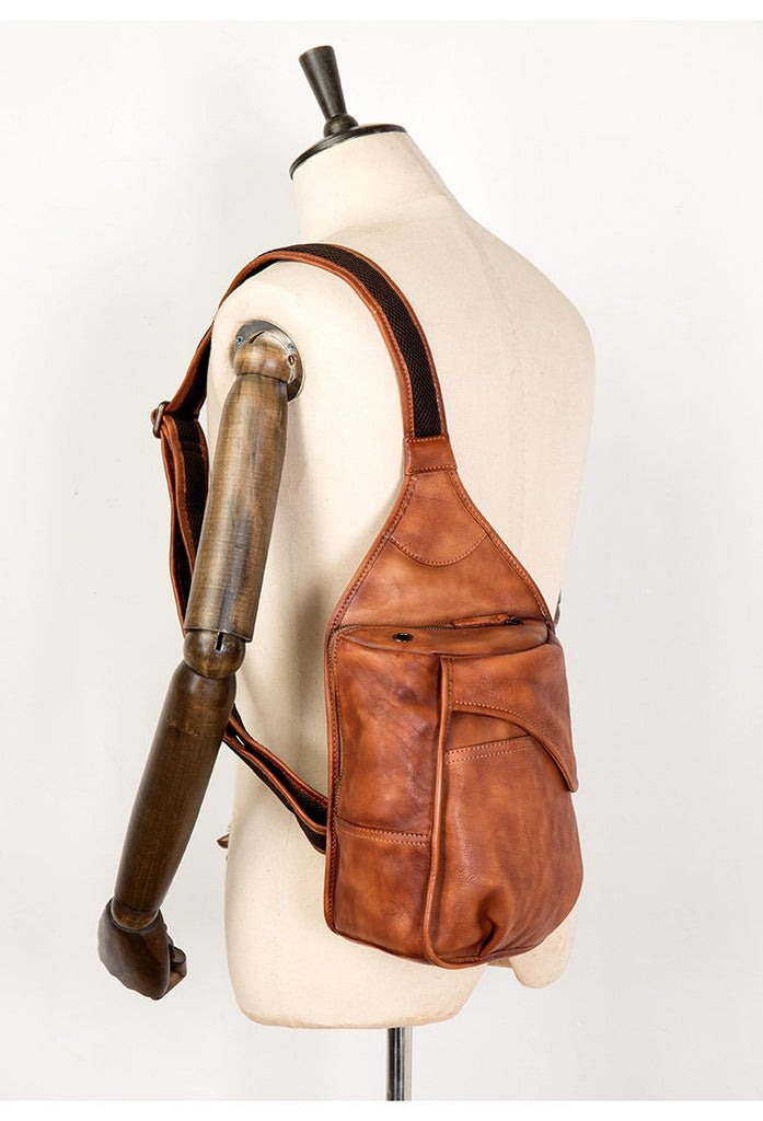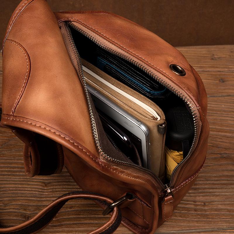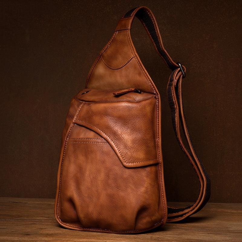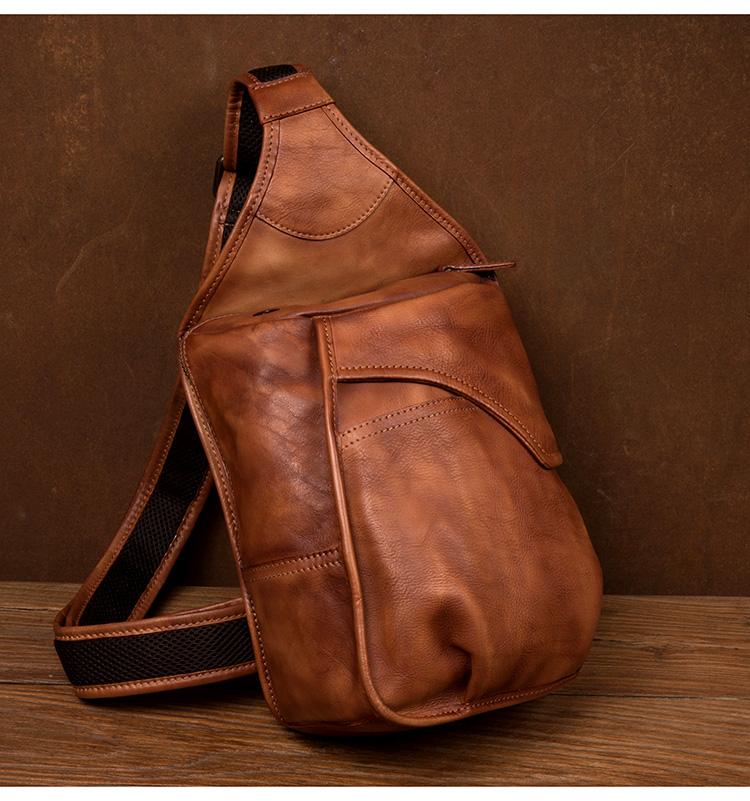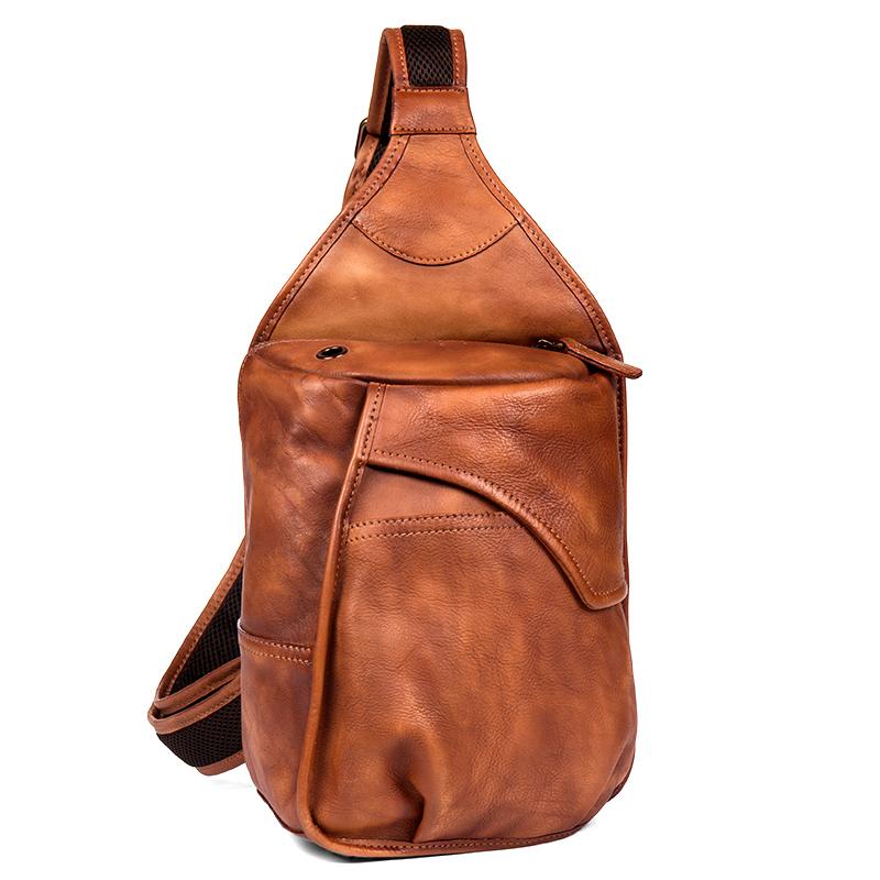 Design: Brown Leather Mens Cool 8 inches Sling Bag Crossbody Bag Chest Bag for men