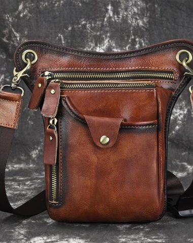 Design: Vintage Brown Leather Men's CELL PHONE HOLSTER MINI SIDE BAG BELT POUCH Drop Leg Bag For Men