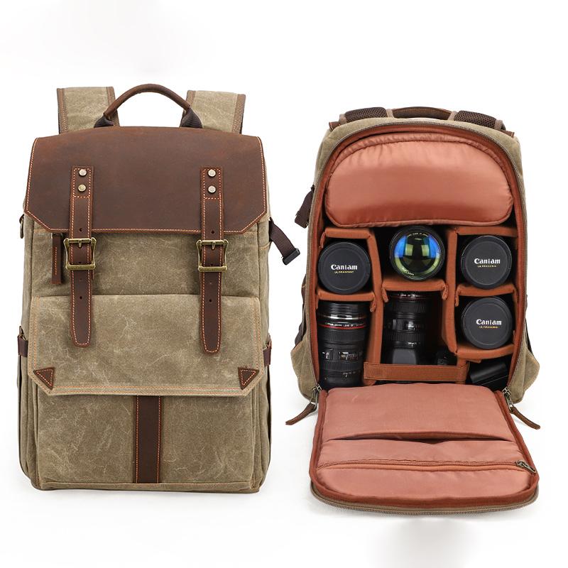 Design: Canvas Leather Mens 12" Camera Backpack Army Green Travel Backpack Khaki College Backpack for Men