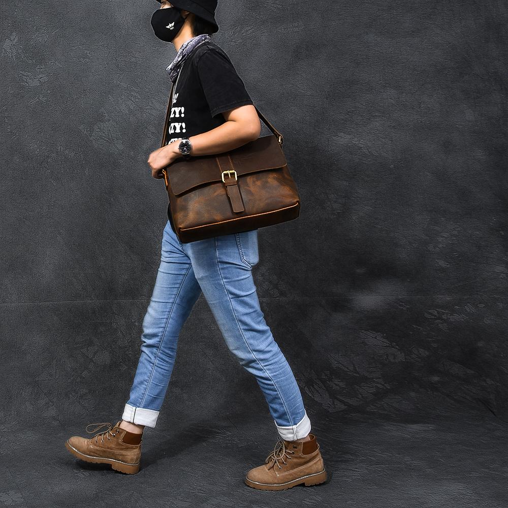 Style: Canvas Leather Mens 13‘’ Brown Side Bag Retro Messenger Bag Shoulder Bag For Men