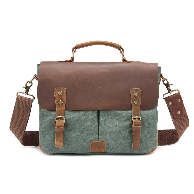 Design: Canvas Leather Mens 14" Simple Khaki Travel Side Bag Lake Green Messenger Bag Brown Shoulder Bag for Men