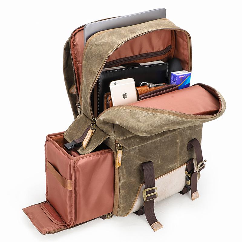 Design: Canvas Leather Mens 18" Waterproof Camera Backpack Army Green Travel Backpack Khaki College Backpack for Men