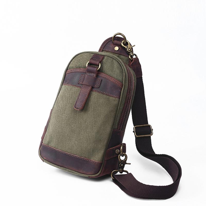 Design: Canvas Leather Mens Green Chest Bag One Shoulder Backpack Gray Sling Bag for Men