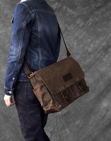 Style: Canvas Leather Mens Large Brown Side Bag 14'' Khaki Messenger Bag Brown Postman Bag For Men