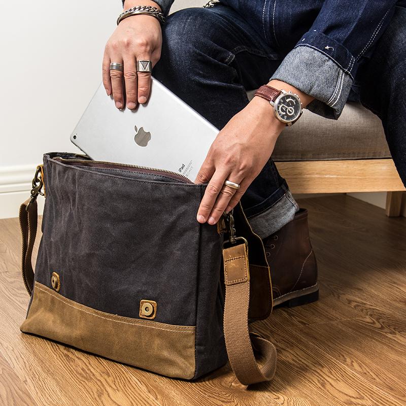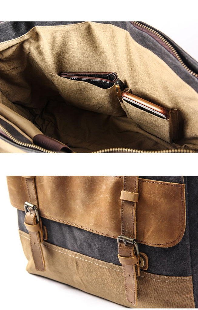 Design: Canvas Leather Mens Side Bag Black 16'' Briefcase Postman Bag Messenger Bag for Men