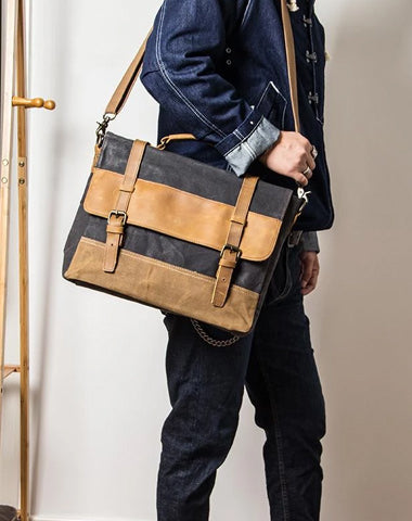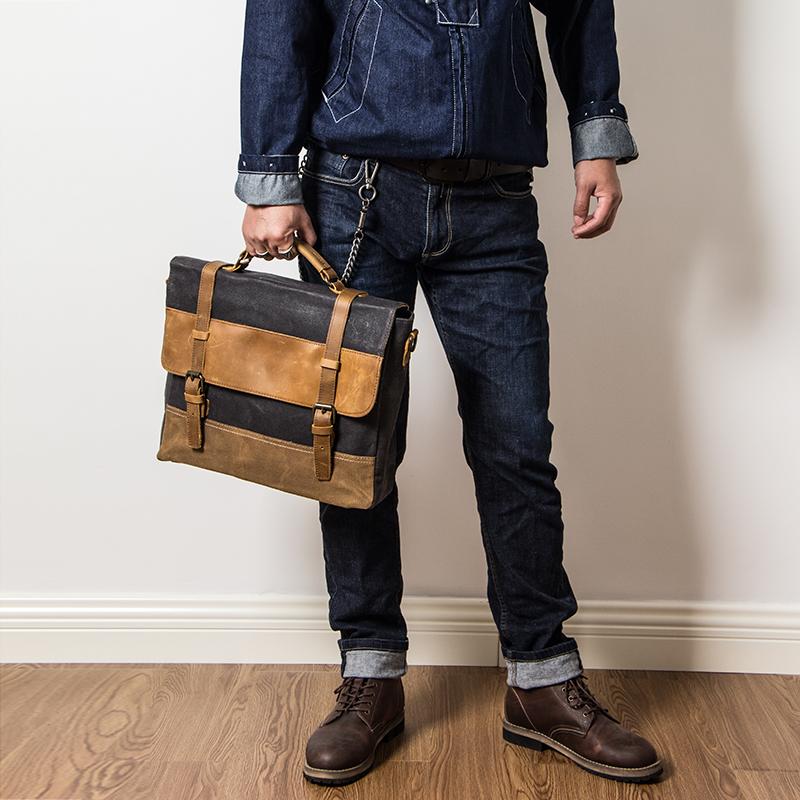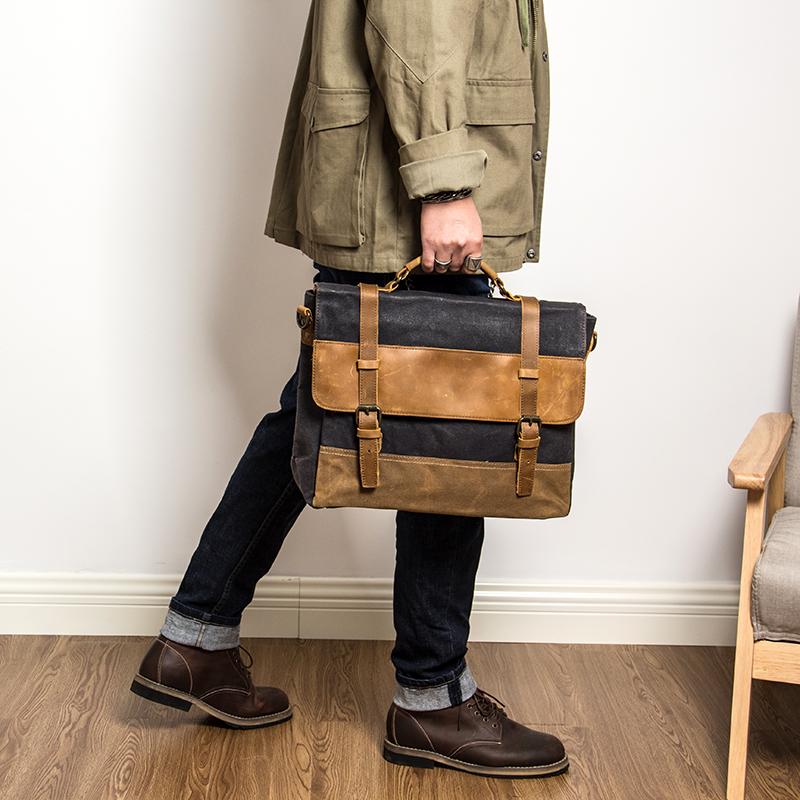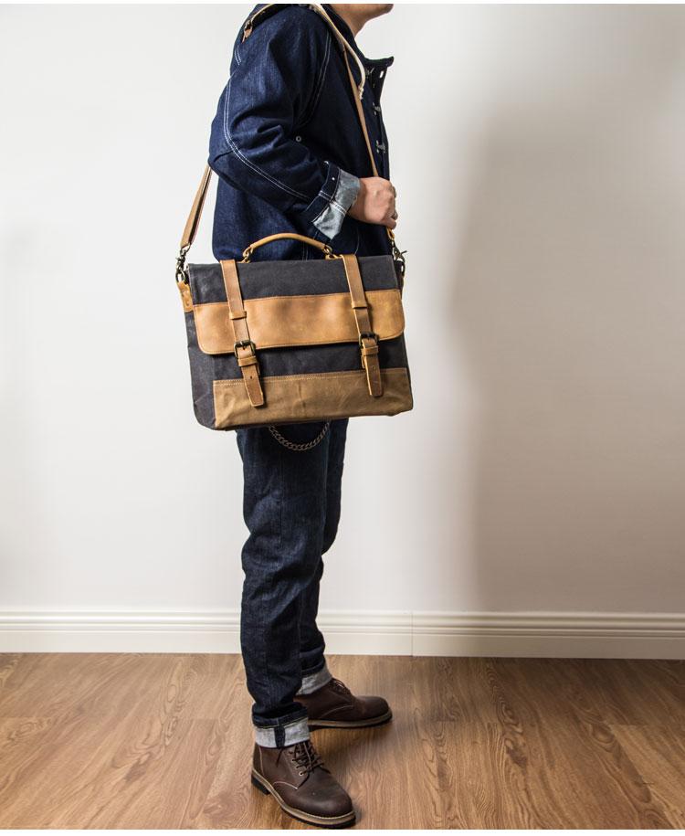 Style: Canvas Leather Mens Side Bag Black 16'' Briefcase Postman Bag Messenger Bag for Men