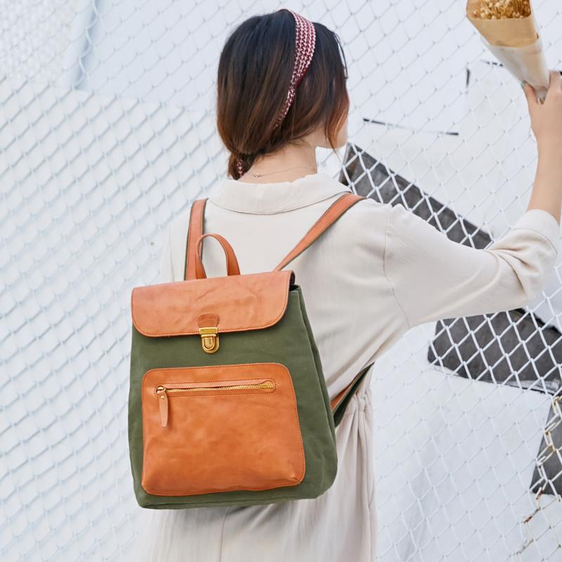 Design: Canvas Leather Mens Women 8" Student Backpack Army Green Travel Backpack Caramel College Backpack for Men