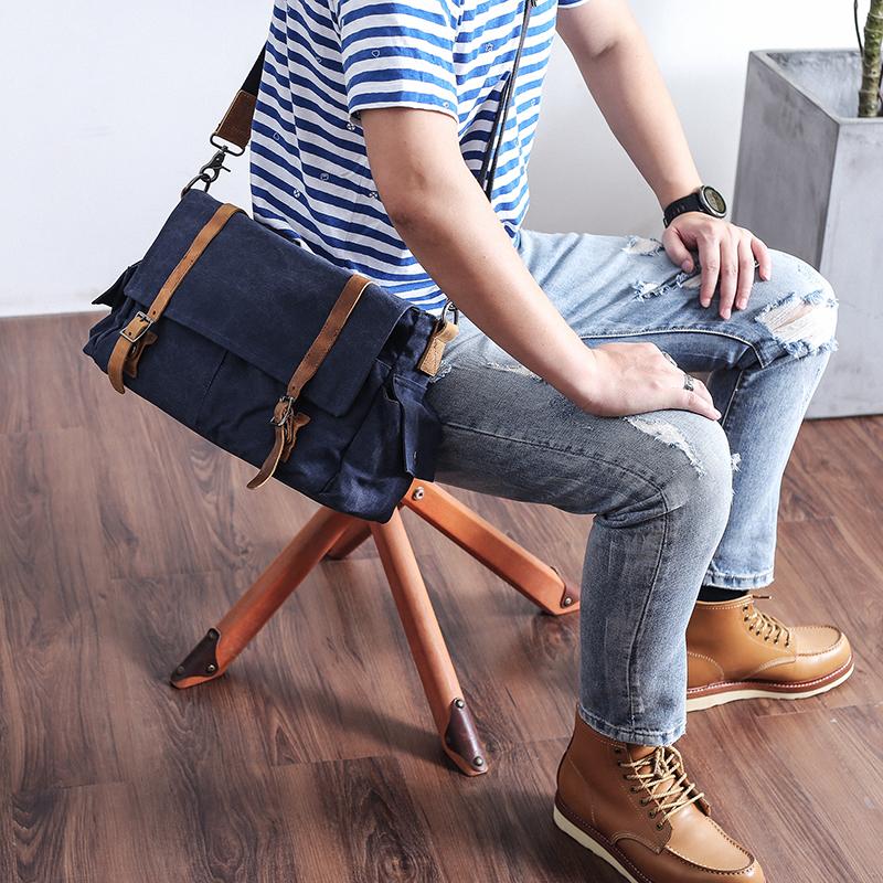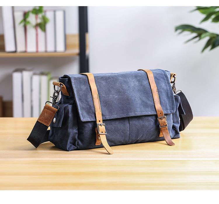 Waxed Canvas Leather Mens Waterproof 10'' Side Bag Courier Bag Blue Messenger Bag For Men