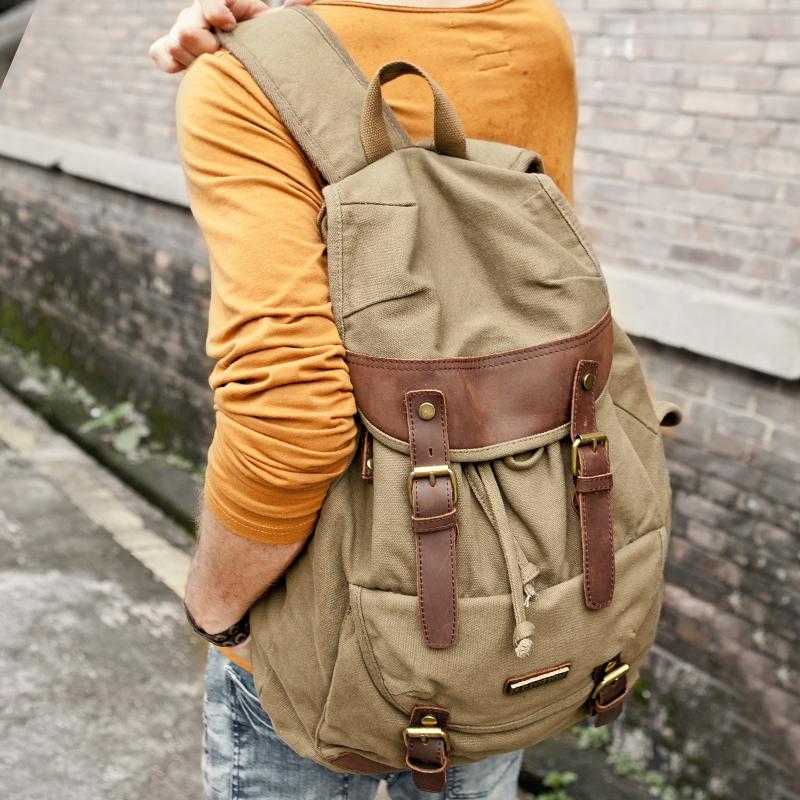 Design: Canvas Leather Women Mens 16" Black Travel Backpack Army Green Computer Bag College Backpack for Men