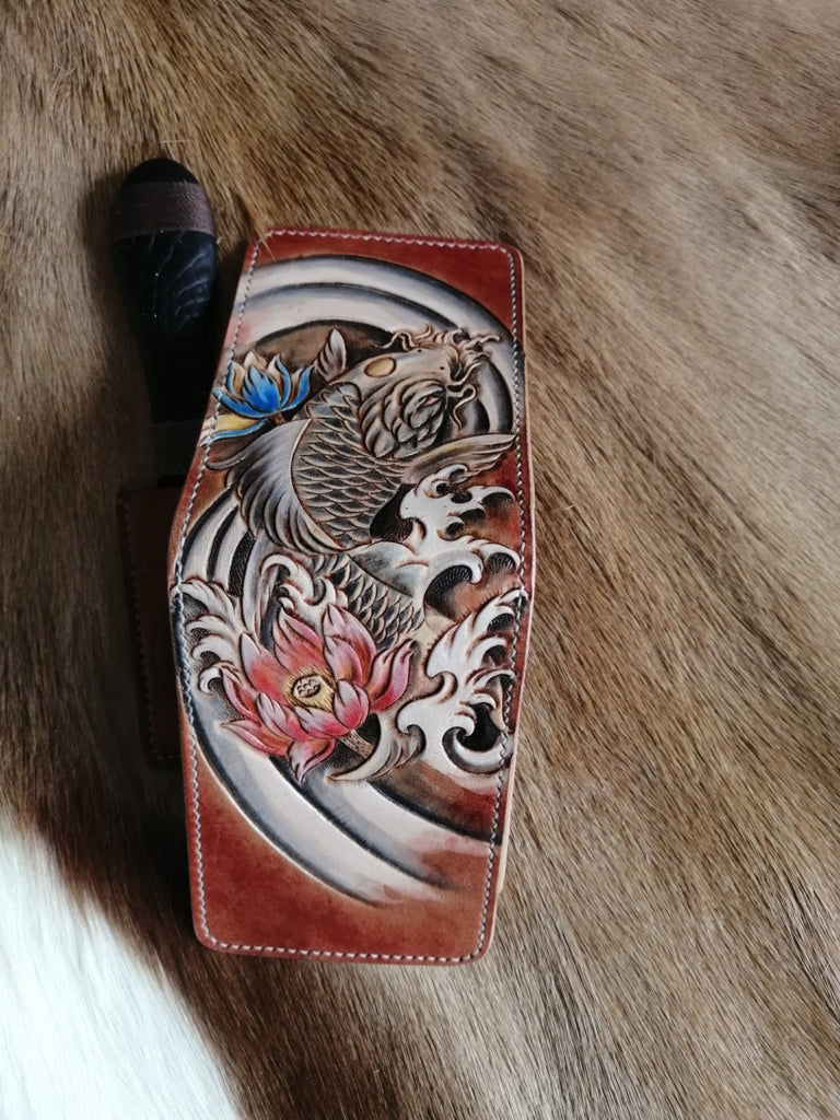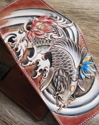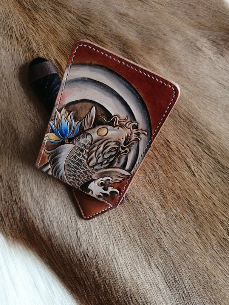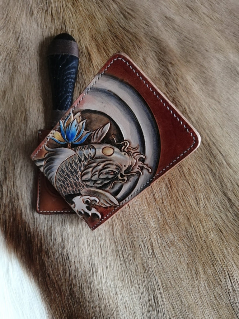 Design: Carp Tooled Leather Wallet Card Wallet with ID Window Koi ID Holder Wallet