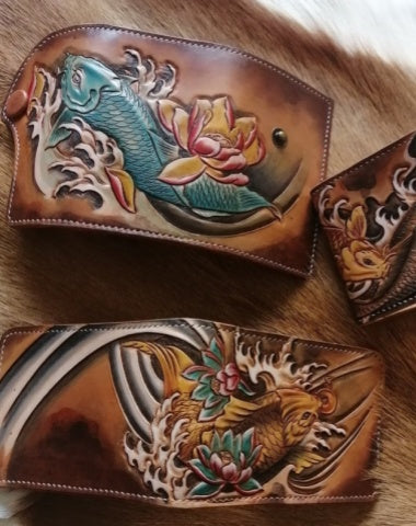 Design: Carp Tooled Leather Wallet Mens Wallet with ID Window Card Wallet with ID Window