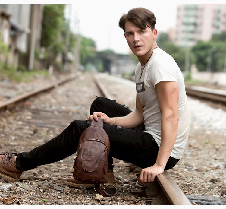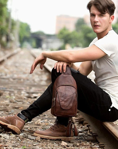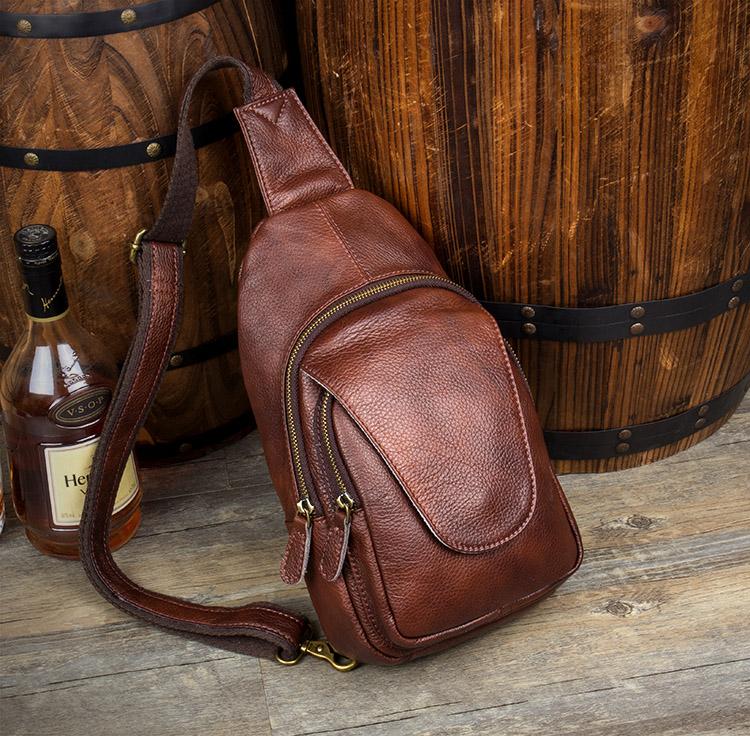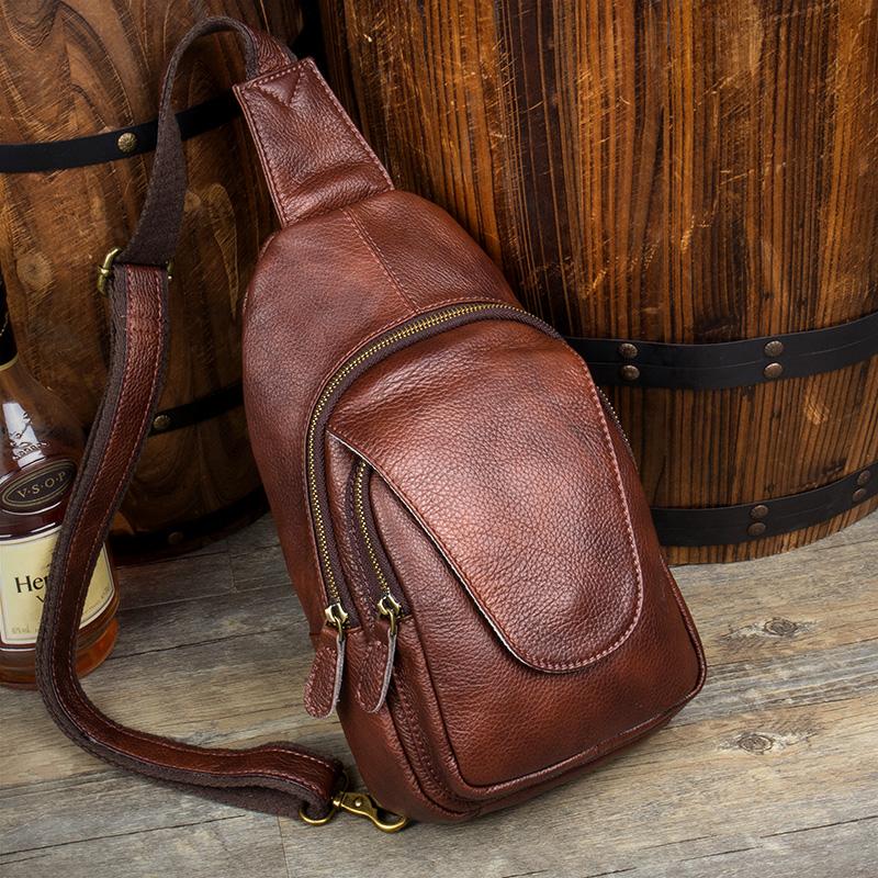 Design: Casual Brown Leather Mens Sling Pack Sling Bags Chest Bag One Shoulder Backpack for Men