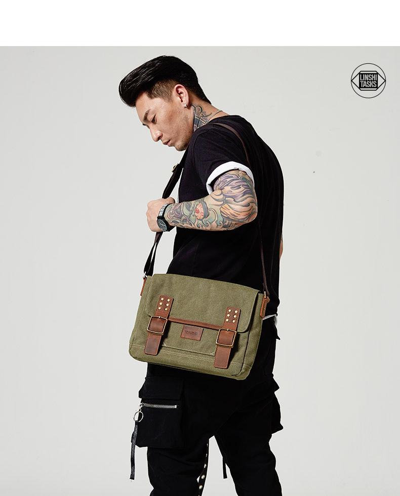 Design: Black Canvas Leather Mens Side Bag Messenger Bags Army Green Canvas Courier Bag for Men