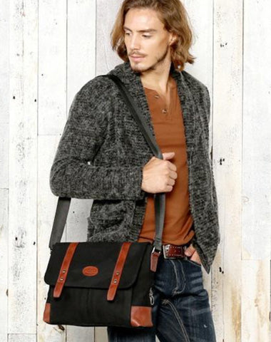 Design: Casual Waxed Canvas Leather Mens Light Brown Side Bag Messenger Bags Black Waxed Canvas Courier Bag for Men