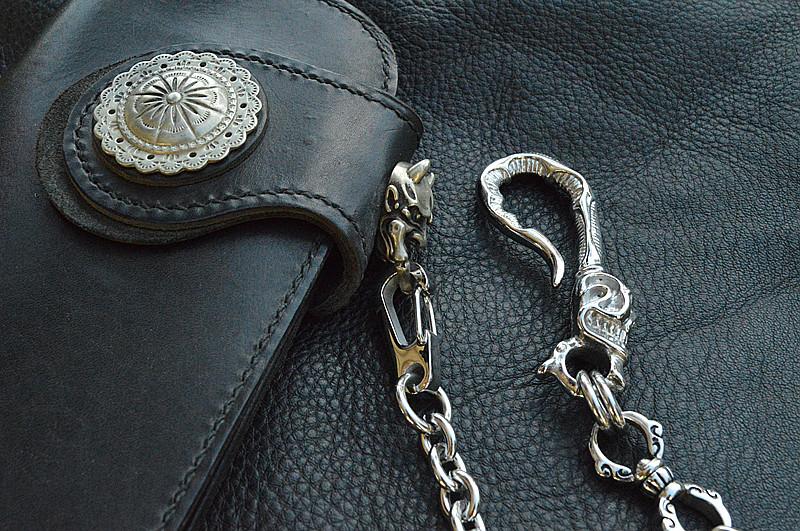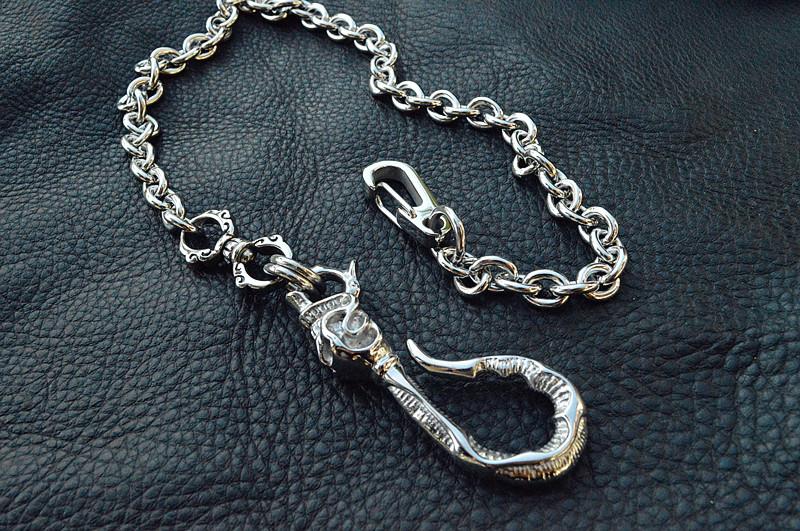 At the opposite end of the chain is the striking skull hook, which is the piece's true focal point. This hook is intricately designed, featuring full carved textures that add depth and character to the chain. The skull motif is a powerful symbol often associated with rebellion, strength, and individuality, making it a fitting choice for bikers and fashion-forward individuals alike. The detailed craftsmanship of the skull hook not only enhances the aesthetic appeal of the chain but also serves as a testament to the high level of skill involved in its creation.