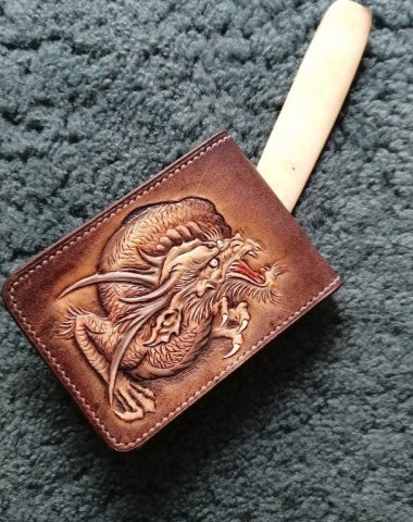 Design: Chinese Dragon ID Holder Wallet Mens Wallet with ID Window Loong Tooled Leather Wallet Card Wallet with ID Window