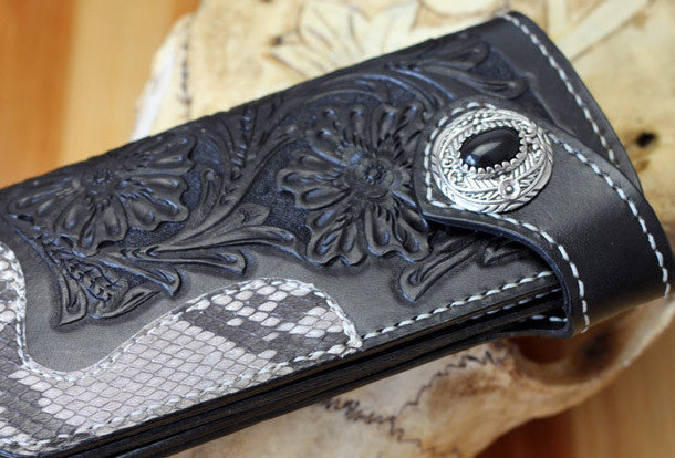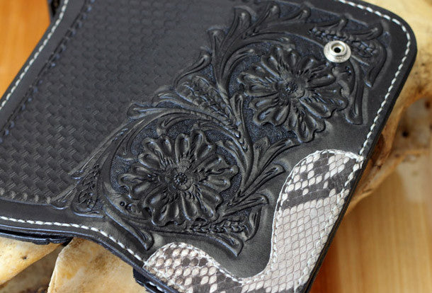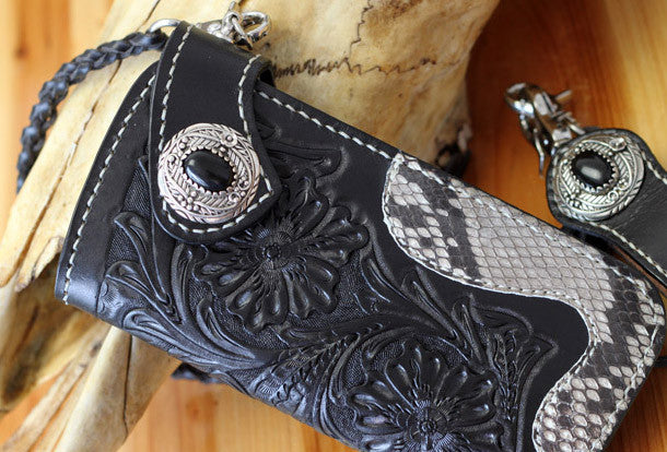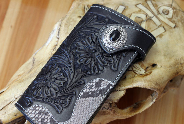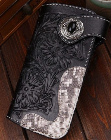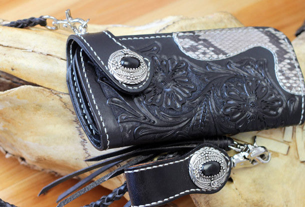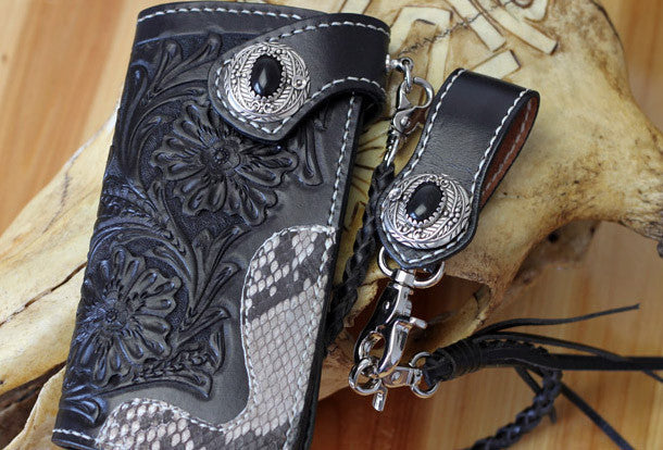 This is handmade black natural Italian Vegetable Tanned leather long floral carved biker wallet chian purse clutch for men.The wallet is bifold,color is black.There are 4 full size bill slots/holders, 12 ID/credit card slots/holders~Hand-made in the traditional method with punched holes and saddle stitching by hand.