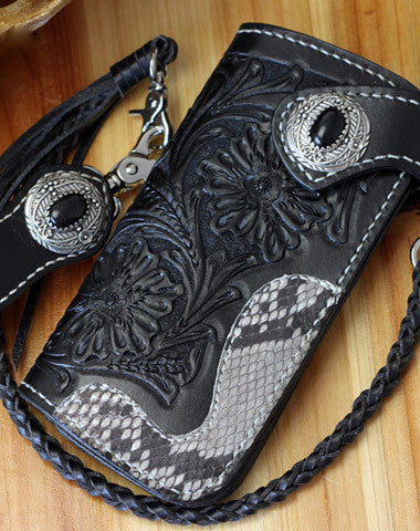 This is handmade black natural Italian Vegetable Tanned leather long floral carved biker wallet chian purse clutch for men.The wallet is bifold,color is black.The