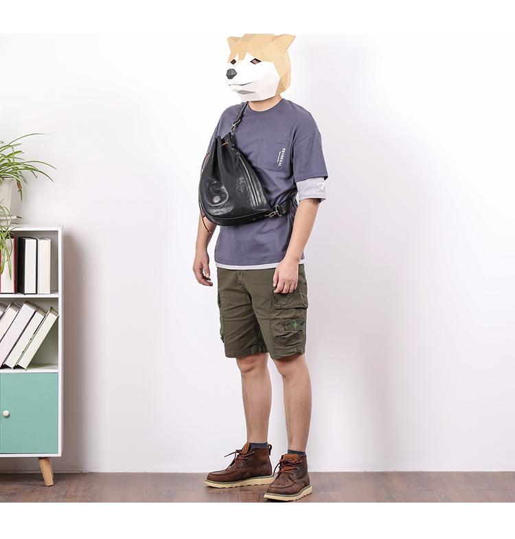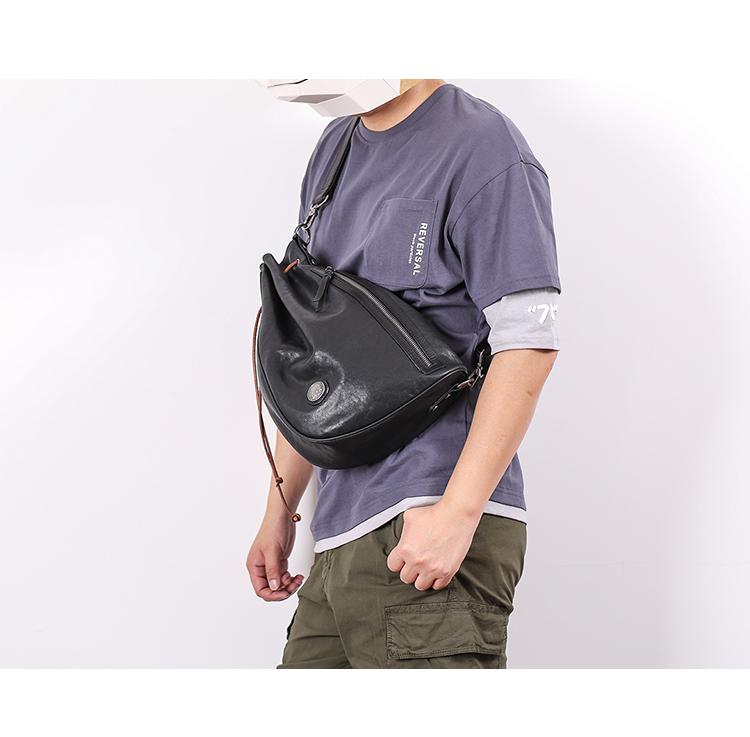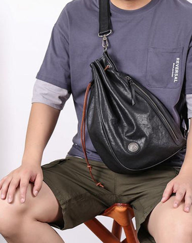 Design: Cool Black Leather Men's Bucket Bag Chest Bag One shoulder Backpack Crossbody Bag For Men