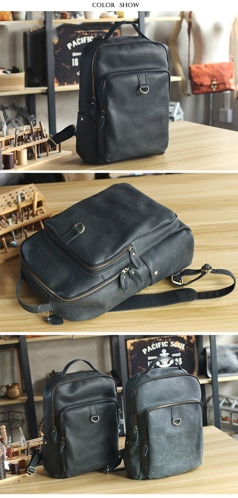 Design: Cool Black Leather Mens Travel Backpack Work Handbags 14 inches Work Backpack For Men