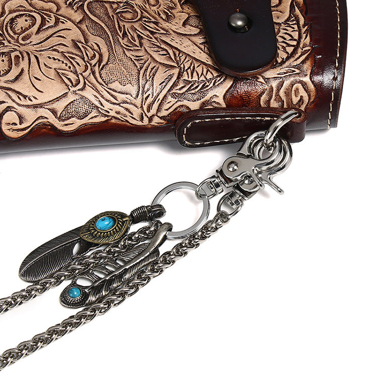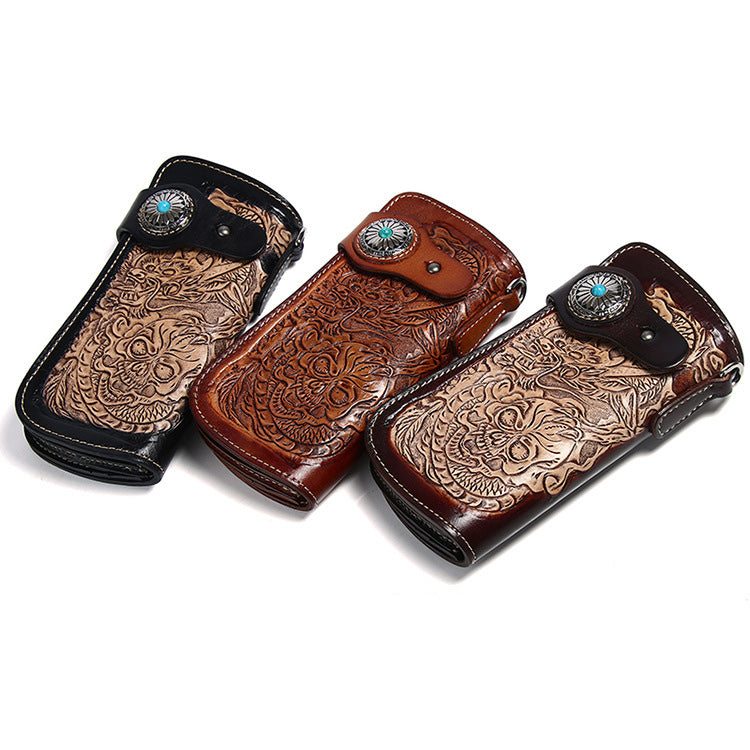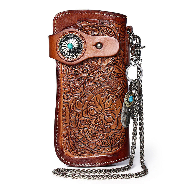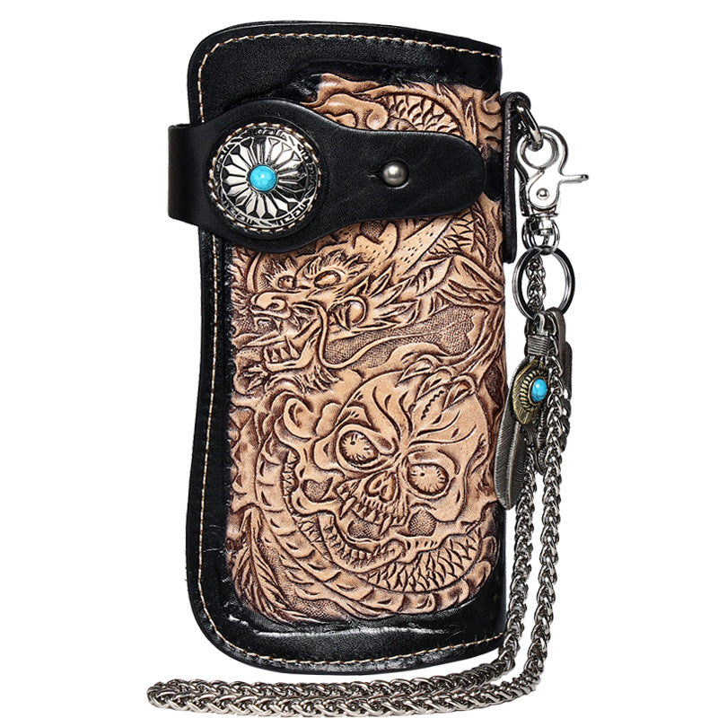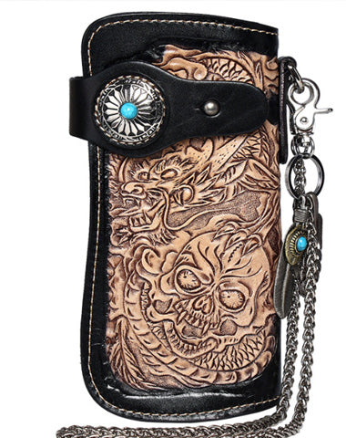 Design: Cool Leather Tooled Dragon&Skull Biker Wallet Handmade Biker Chain Wallet for Men