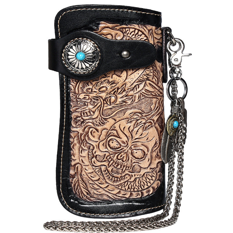 Design: Cool Leather Tooled Dragon&Skull Biker Wallet Handmade Biker Chain Wallet for Men