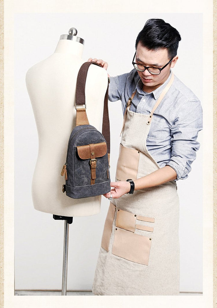 Style: Cool Canvas Leather Mens 8 inches Black Chest Bag Shoulder Bag Crossbody Bag For Men