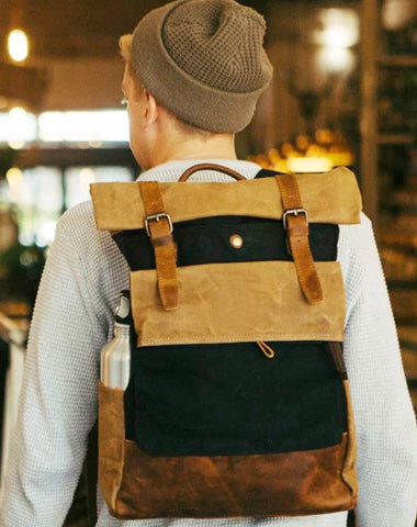 Design: Cool Waxed Canvas Leather Mens Black 15'' Large Waterproof Travel Backpacks Computer Hiking Backpack for Men