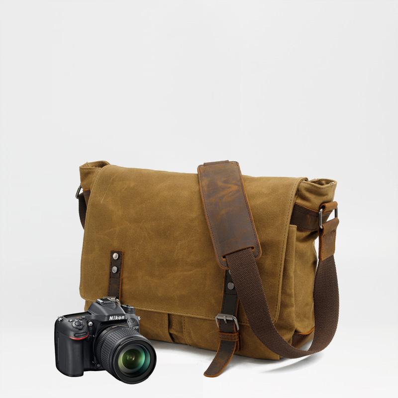 Design: Waxed Canvas Leather Mens Black Waterproof 14'' Camera Bag Gray Side Bag Messenger Bag Shoulder Bag For Men