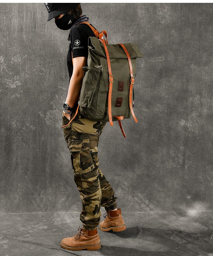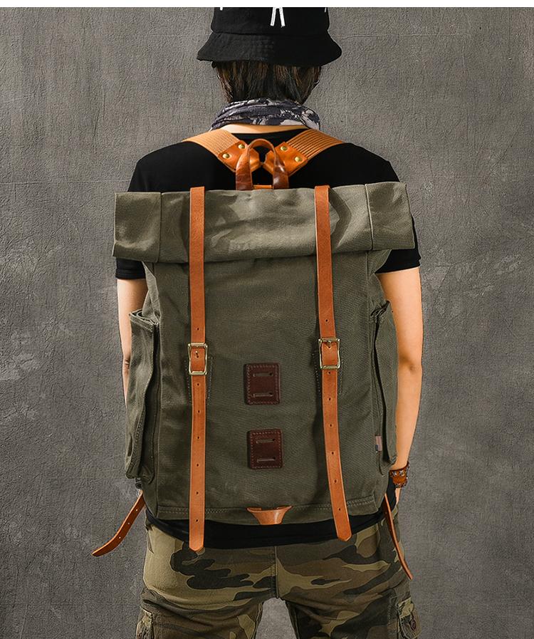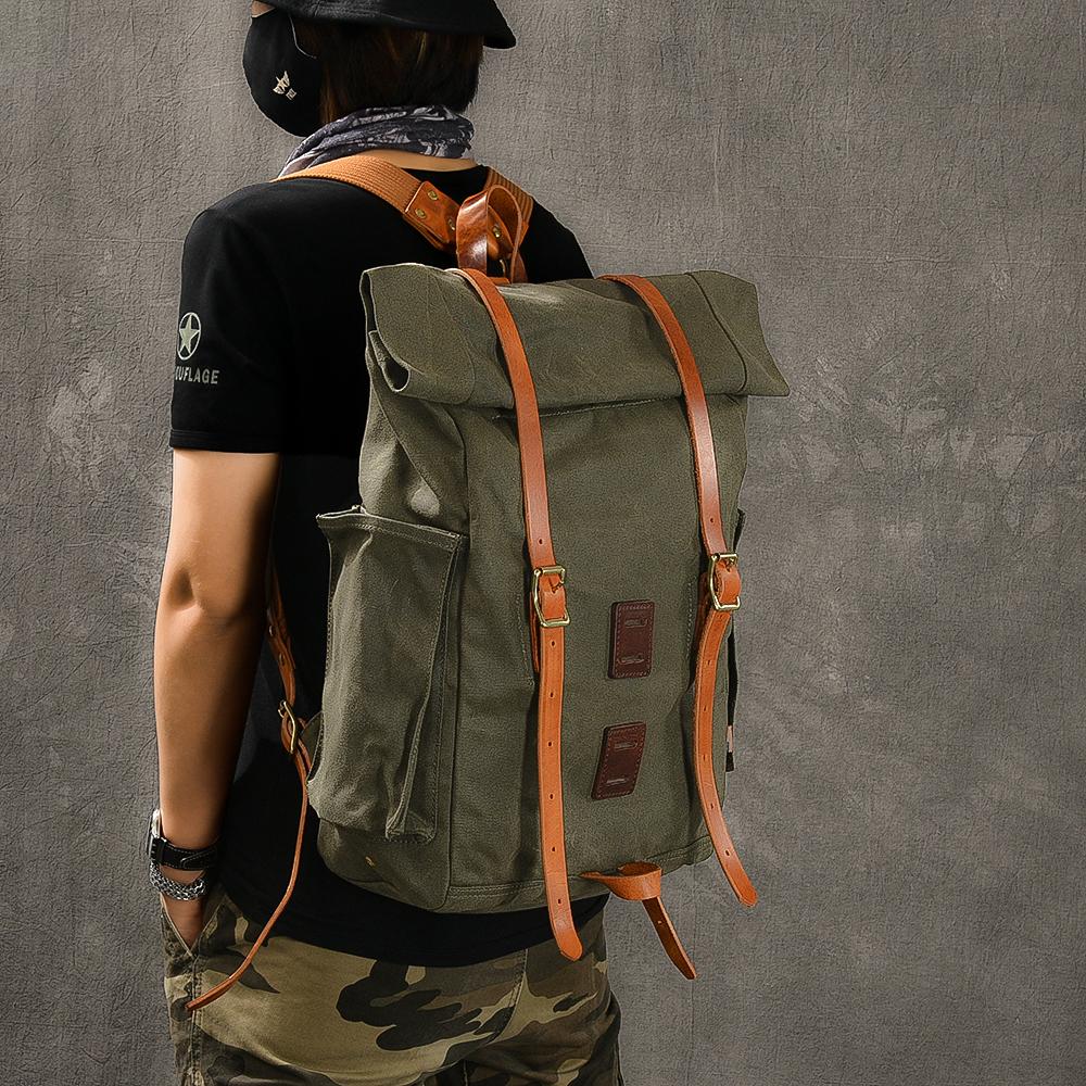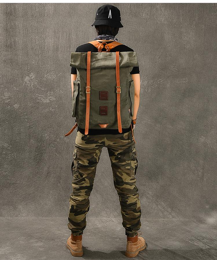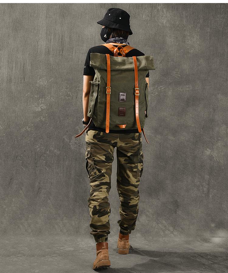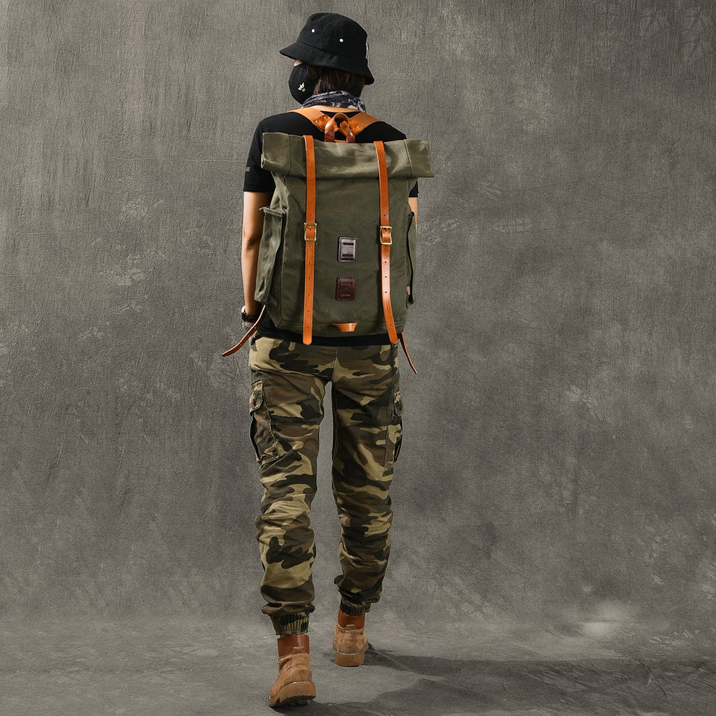 Style: Cool Canvas Leather Mens Womens 26" Army Green Hiking Backpack Travel Backpack College Backpack for Men