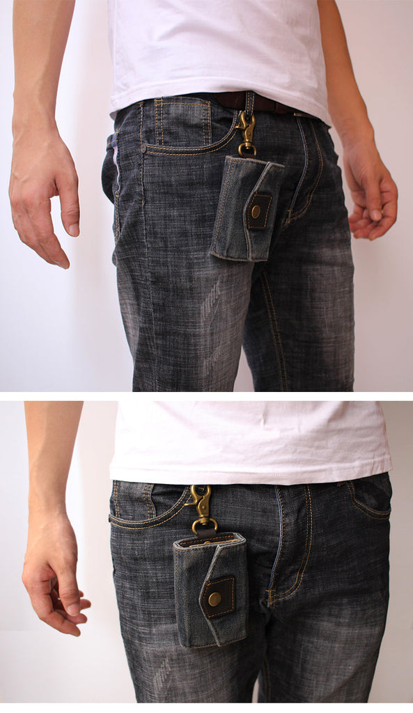 Crafted from resilient denim, the wallet not only reflects a bygone era's aesthetic but also promises durability for your daily adventures. The inclusion of a sturdy belt clip ensures easy attachment to belts or bags, providing a seamless and hands-free experience for your keys.