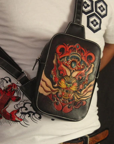 Design: Cool Handmade Tooled Leather Brave Troops Sling Bag Chest Bag One Shoulder Backpack For Men